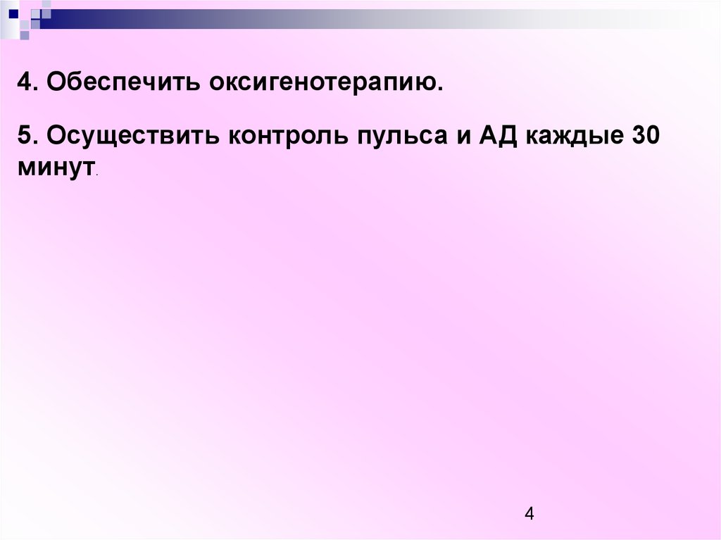 4. Обеспечить оксигенотерапию.5. Осуществить контроль пульса и АД каждые 30