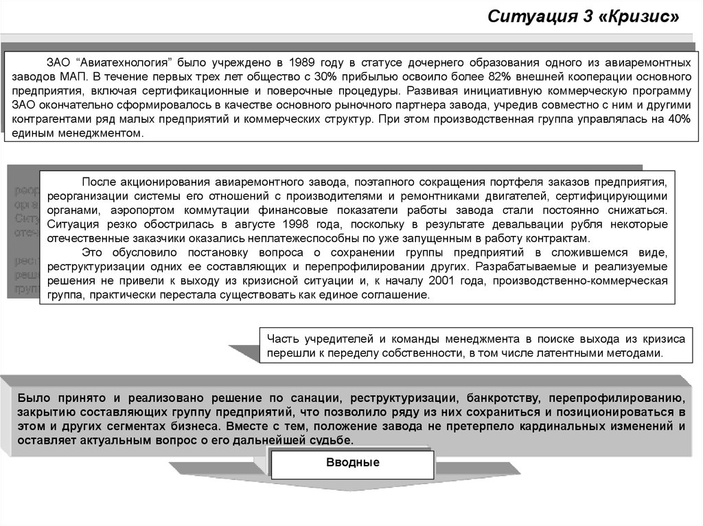 Ситуация 3 «Кризис»ЗАО “Авиатехнология” было учреждено в 1989 году в статусе дочернего образования одного из авиаремонтных