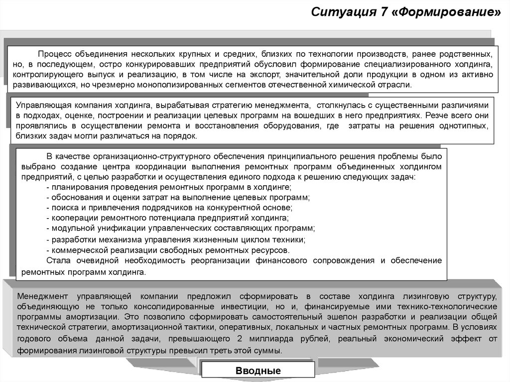 Ситуация 7 «Формирование»Процесс объединения нескольких крупных и средних, близких по технологии производств, ранее родственных,