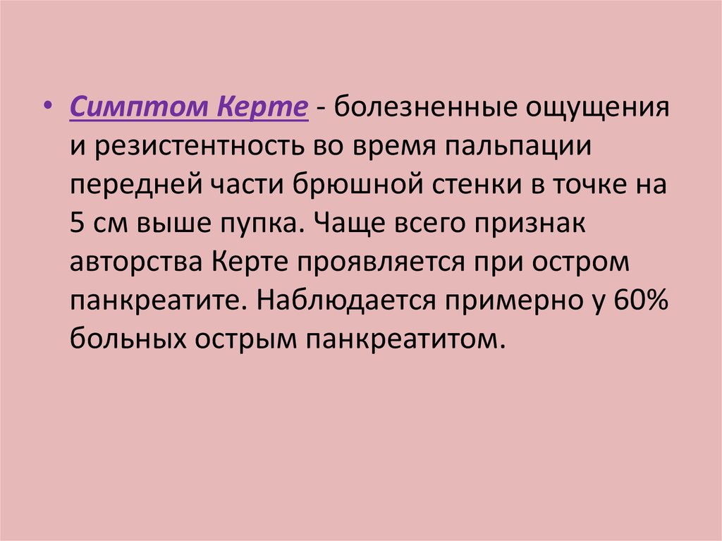 • Симптом Керте - болезненные ощущенияи резистентность во время пальпации