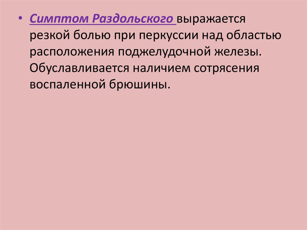 • Симптом Раздольского выражаетсярезкой болью при перкуссии над областью