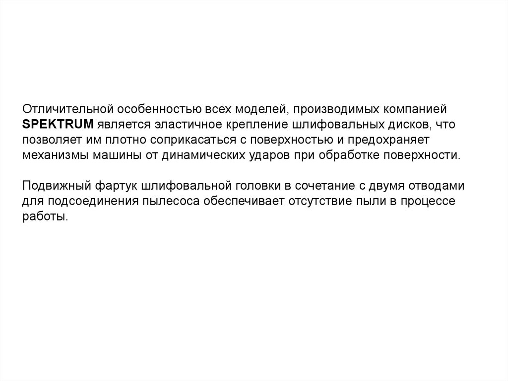 Отличительной особенностью всех моделей, производимых компаниейSPEKTRUM является эластичное крепление шлифовальных дисков, что