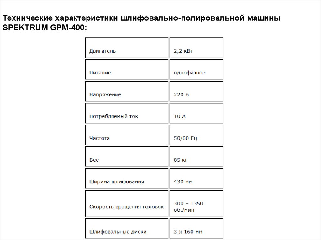 Технические характеристики шлифовально-полировальной машиныSPEKTRUM GPM-400:
