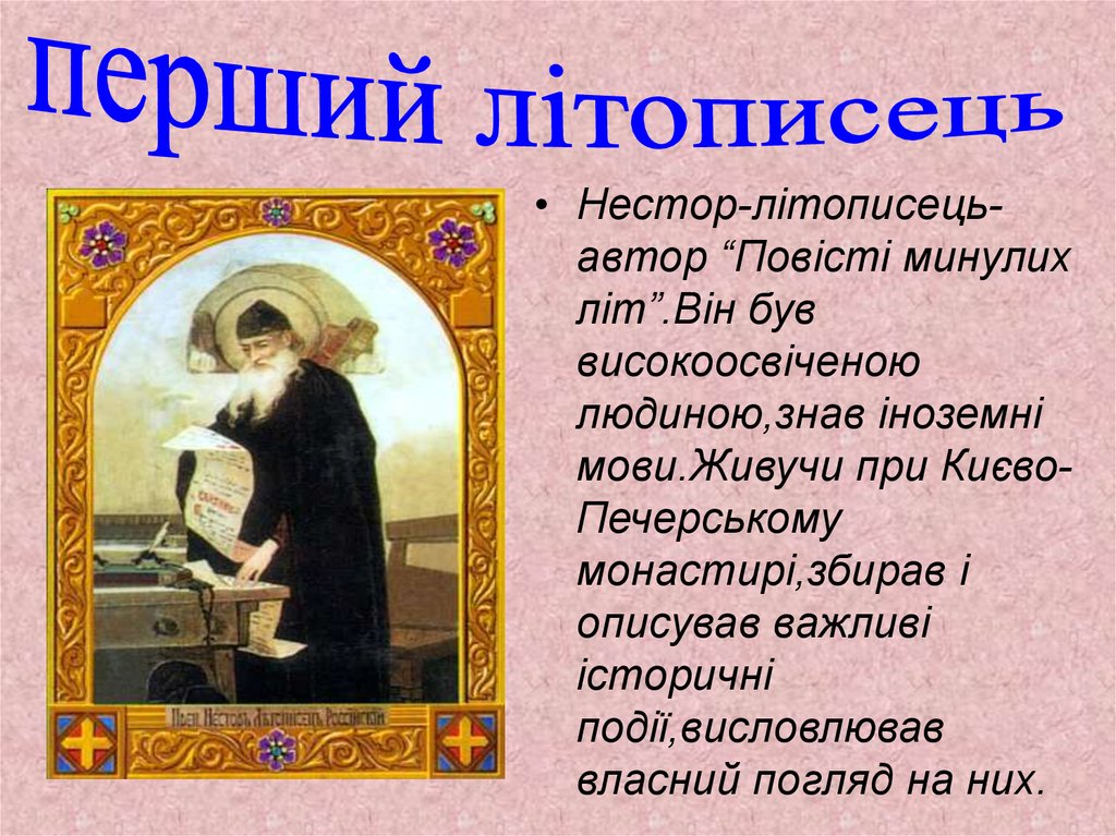 • Нестор-літописецьавтор “Повісті минулихліт”.Він був