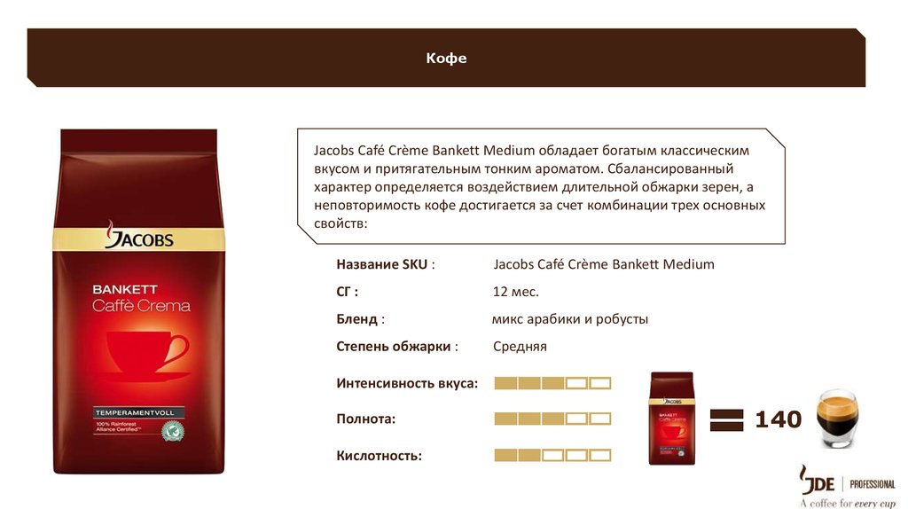 КофеJacobs Café Crème Bankett Medium обладает богатым классическим