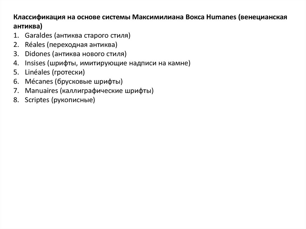•класифікація по системі французького дослідника типографіки Максиміліана Вокса;
