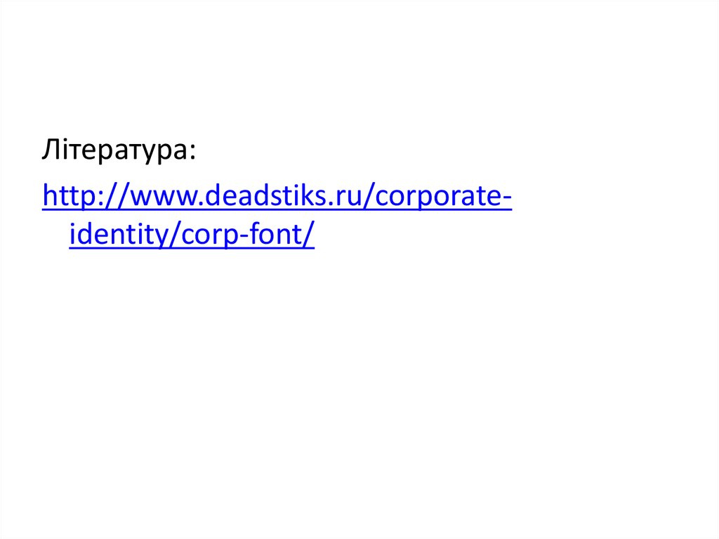 Література:http://www.deadstiks.ru/corporateidentity/corp-font/