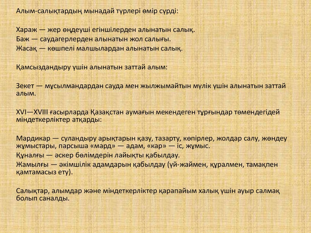 Алым-салықтардың мынадай түрлері өмір сүрді:Хараж — жер өңдеуші егіншілерден алынатын салық.