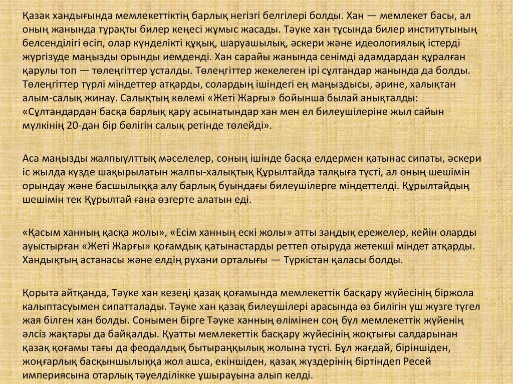 Қорыта айтқанда, Тәуке хан кезеңі қазақ қоғамында мемлекеттік басқару жүйесінің біржола