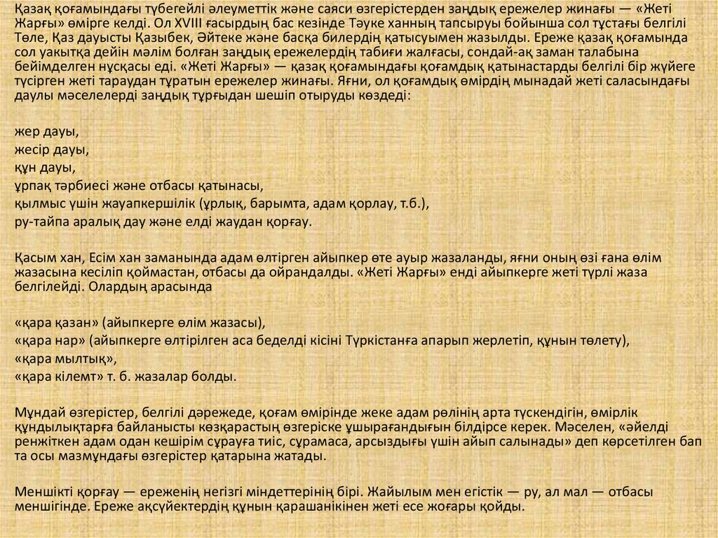 «Жеті Жарғы» — ұрлық, қарақшылық, зорлық-зомбылық, сондай-ақморальдық азғындау сияқты жат қылықтарға байланысты өте қатал