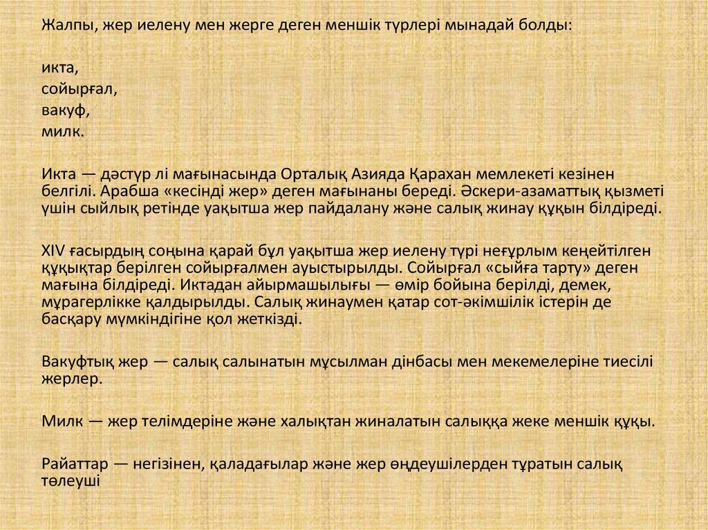 Жалпы, жер иелену мен жерге деген меншік түрлері мынадай болды:икта,