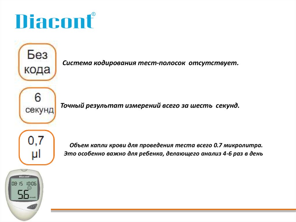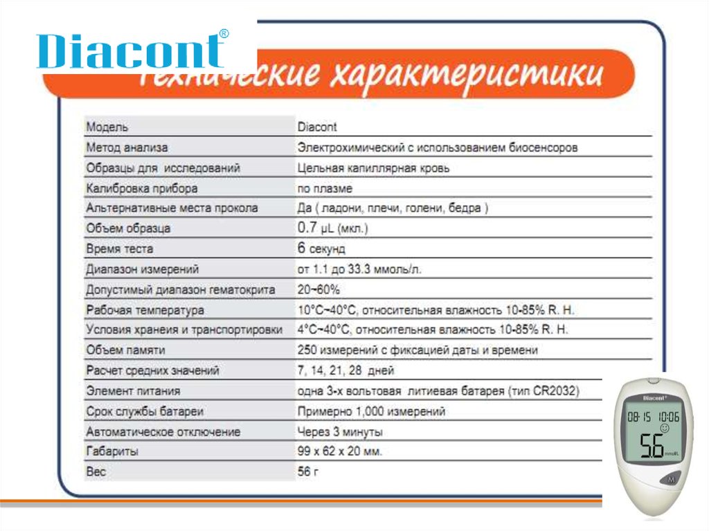 минимальную погрешность измерения < 3%, что ставит глюкометр Diacont на