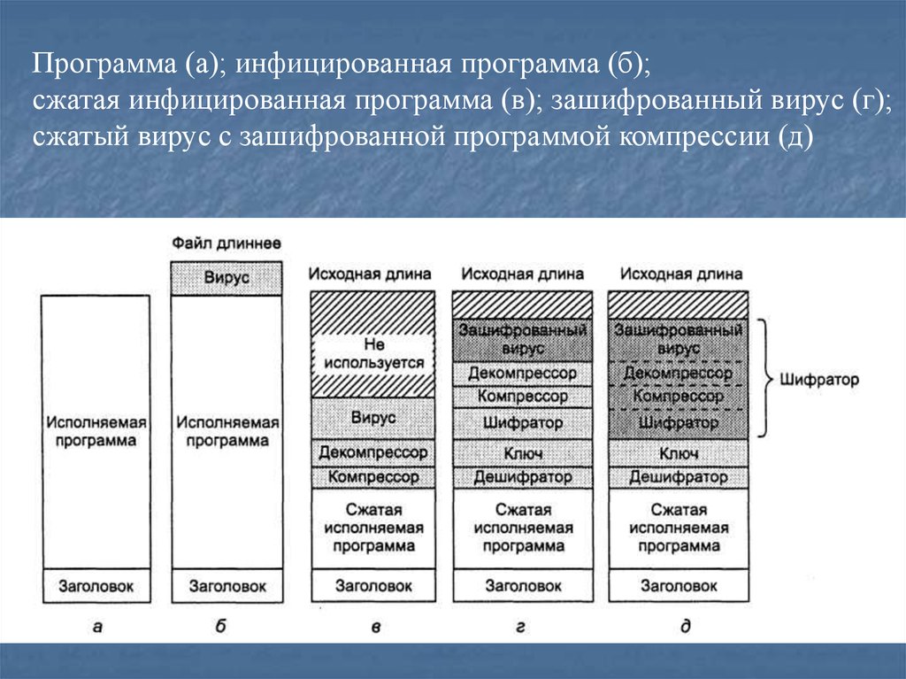 Программа (а); инфицированная программа (б);сжатая инфицированная программа (в); зашифрованный вирус (г);