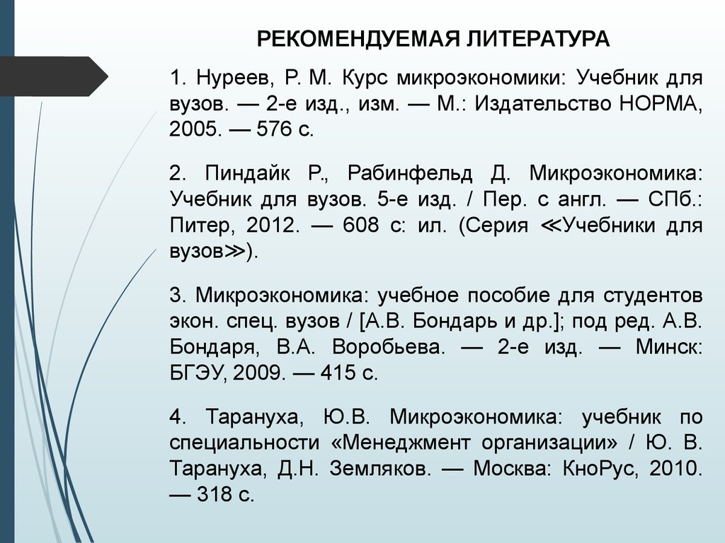 РЕКОМЕНДУЕМАЯ ЛИТЕРАТУРА1. Нуреев, Р. М. Курс микроэкономики: Учебник для