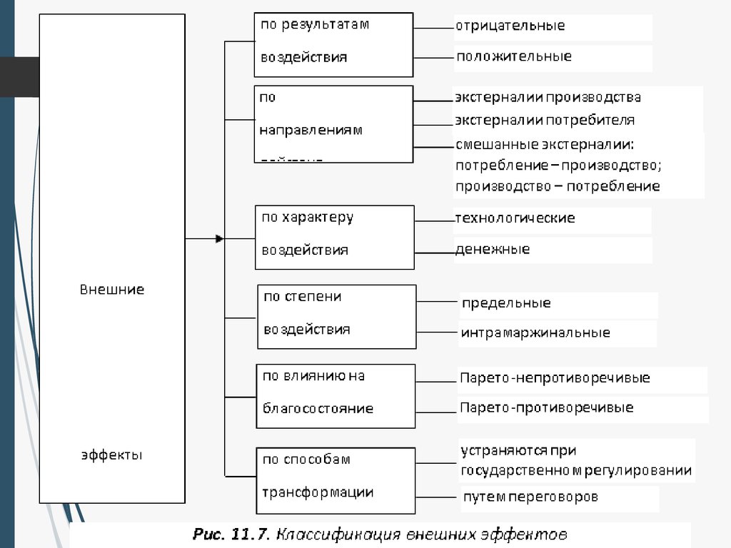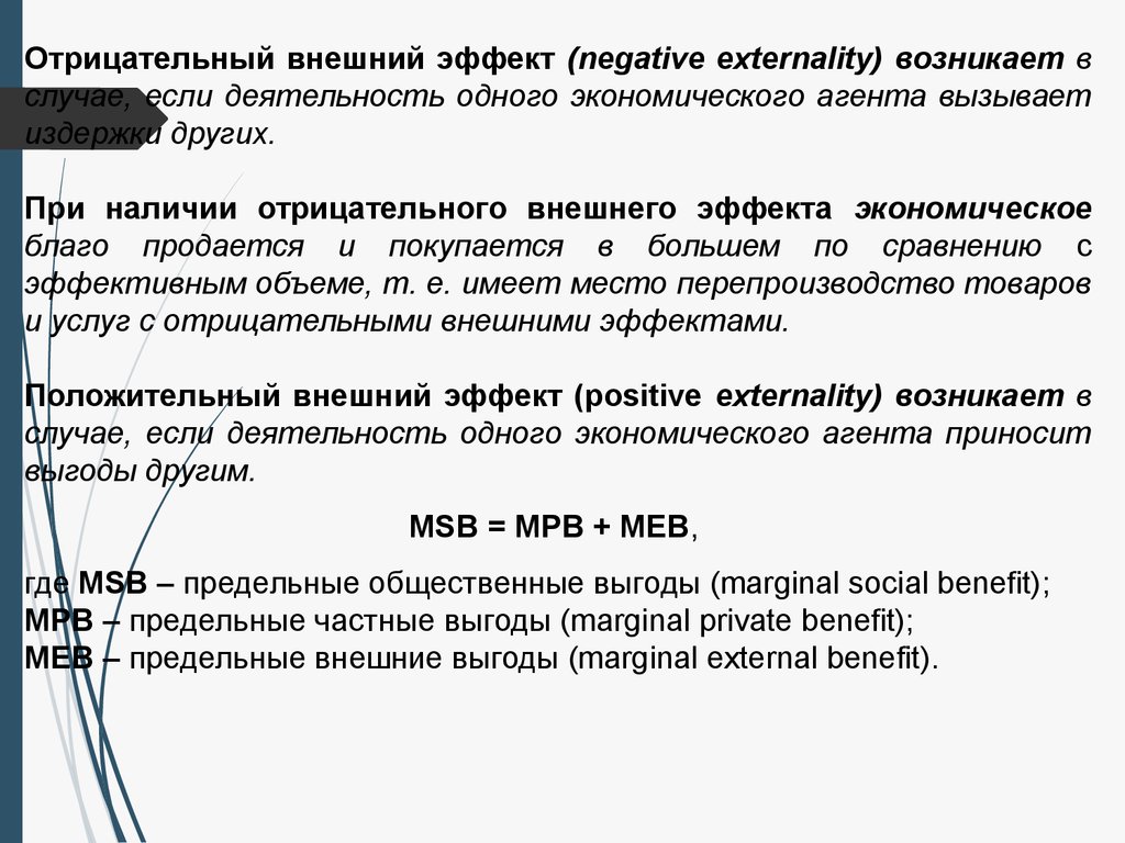 Внешние эффекты — это не учтенные в цене блага побочные эффектыфункционирования рынка, воздействующие на третьих лиц (или общество в