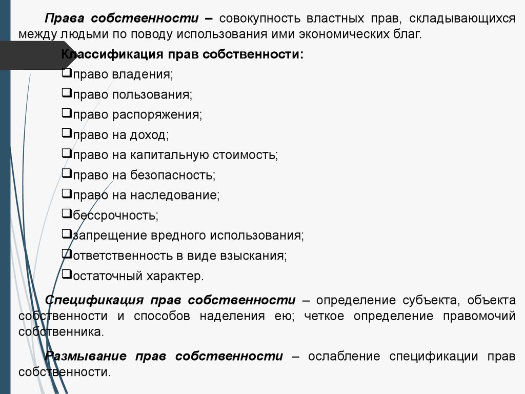 Права собственности – совокупность властных прав, складывающихсямежду людьми по поводу использования ими экономических благ.