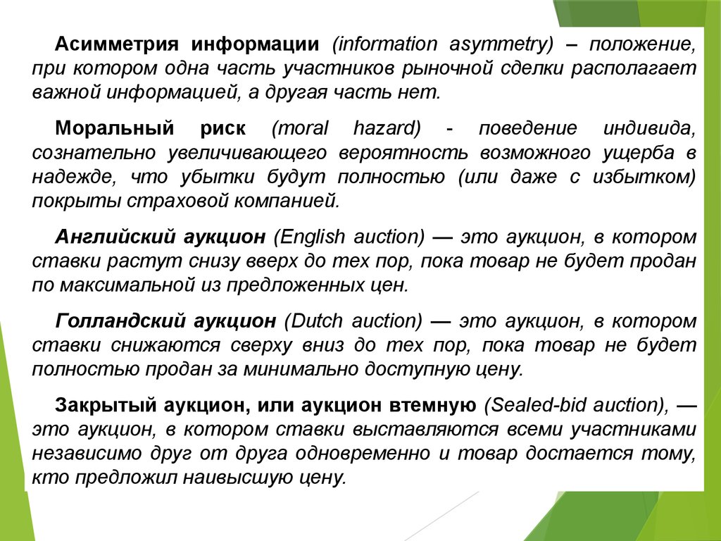 Асимметрия информации (information asymmetry) – положение,при котором одна часть участников рыночной сделки располагает