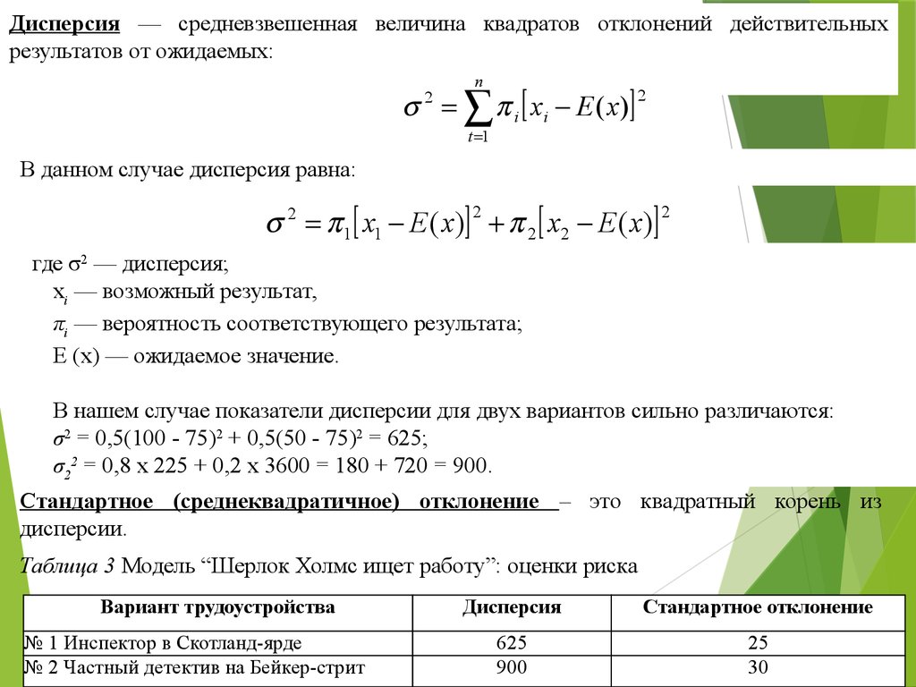Отклонение – это разница между действительным результатом и ожидаемым.Таблица 1. Модель “Шерлок Холмс ищет работу”: сравнение вариантов при