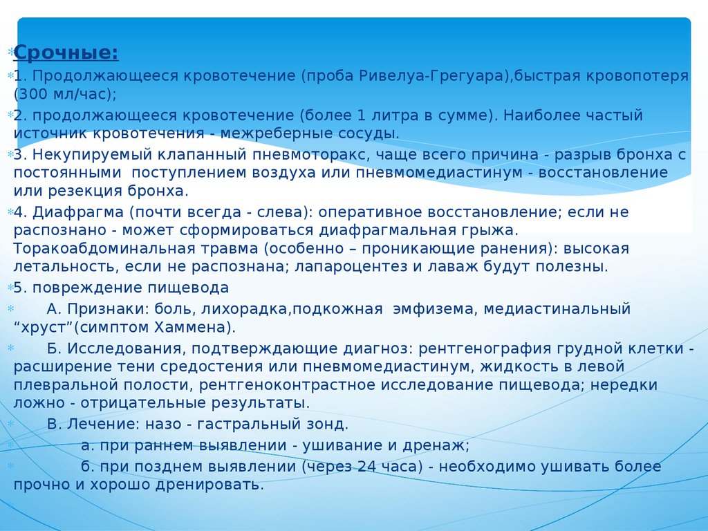 11. Показания к торакотомии. Различают неотложные, срочные и отсроченные торакотомии.