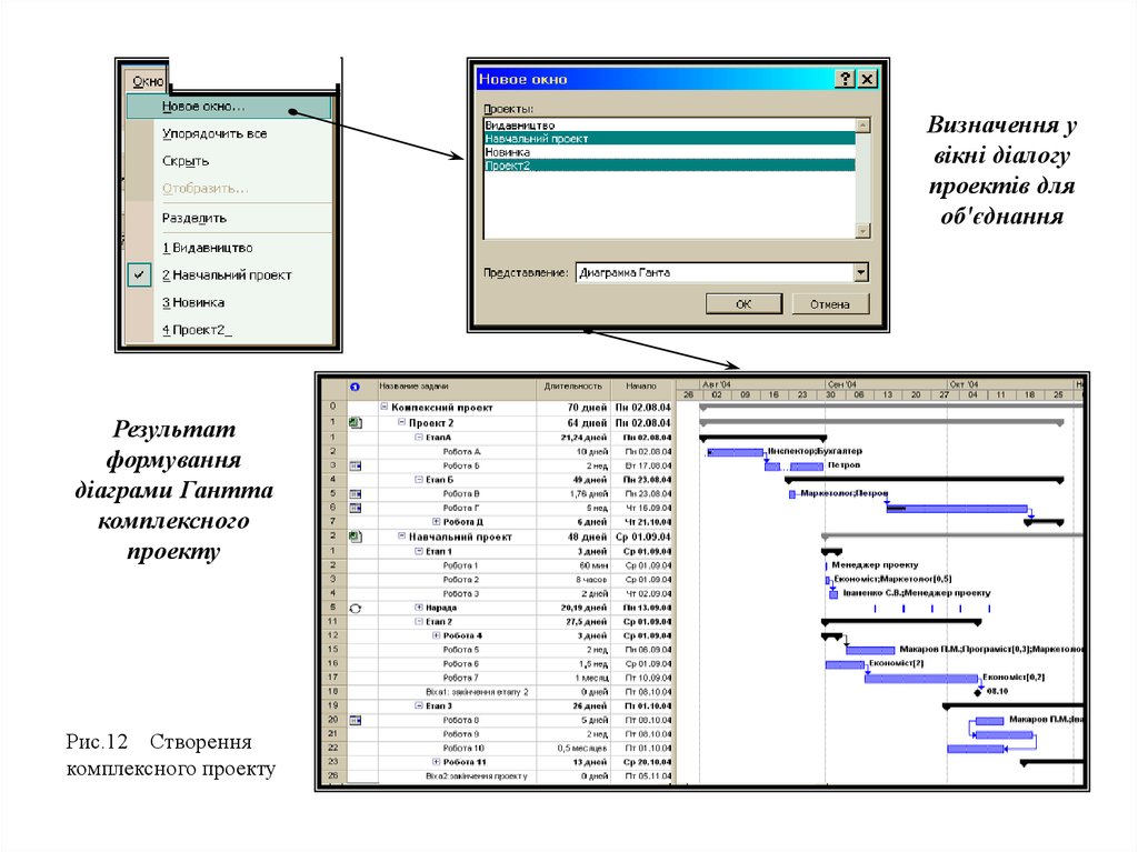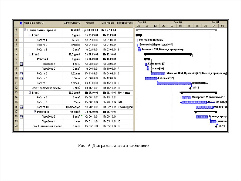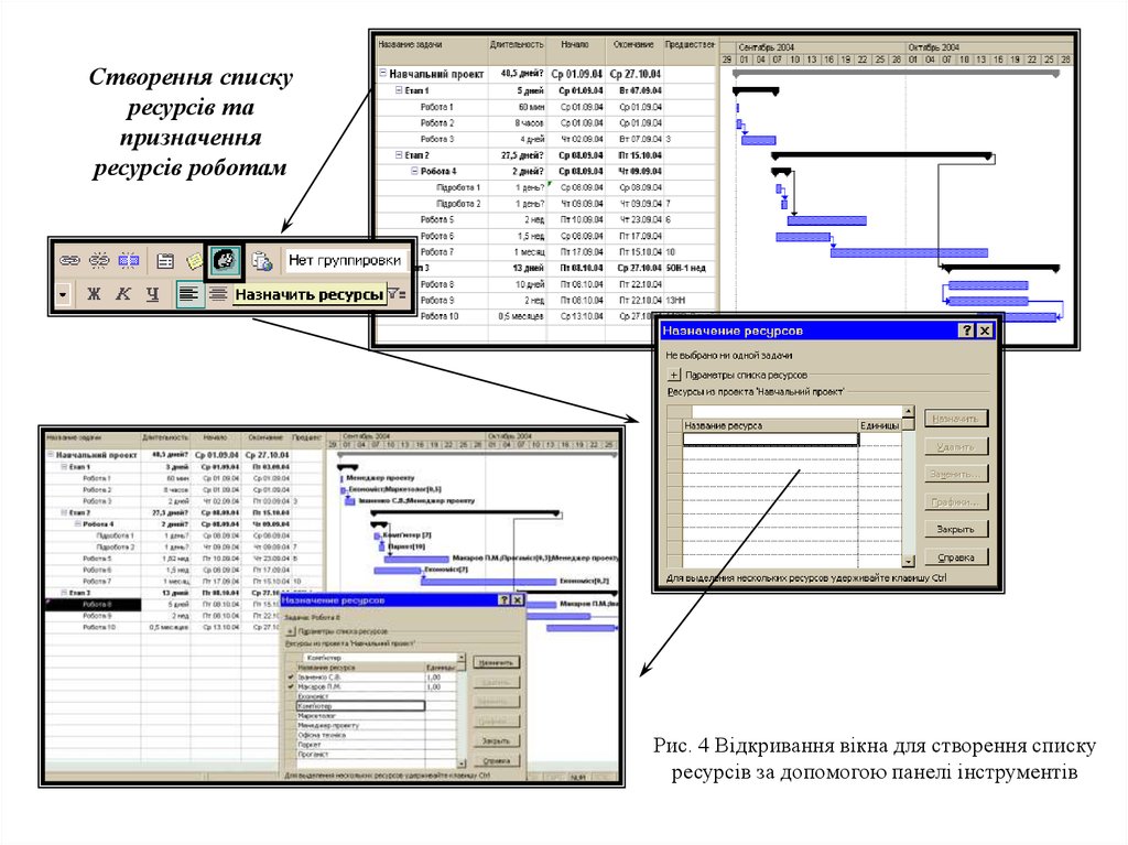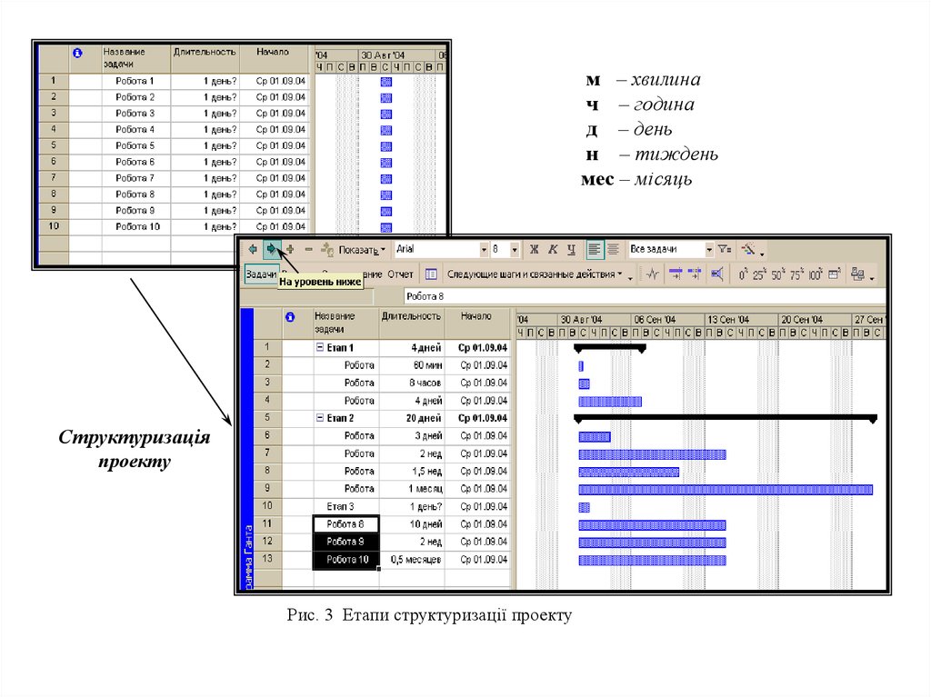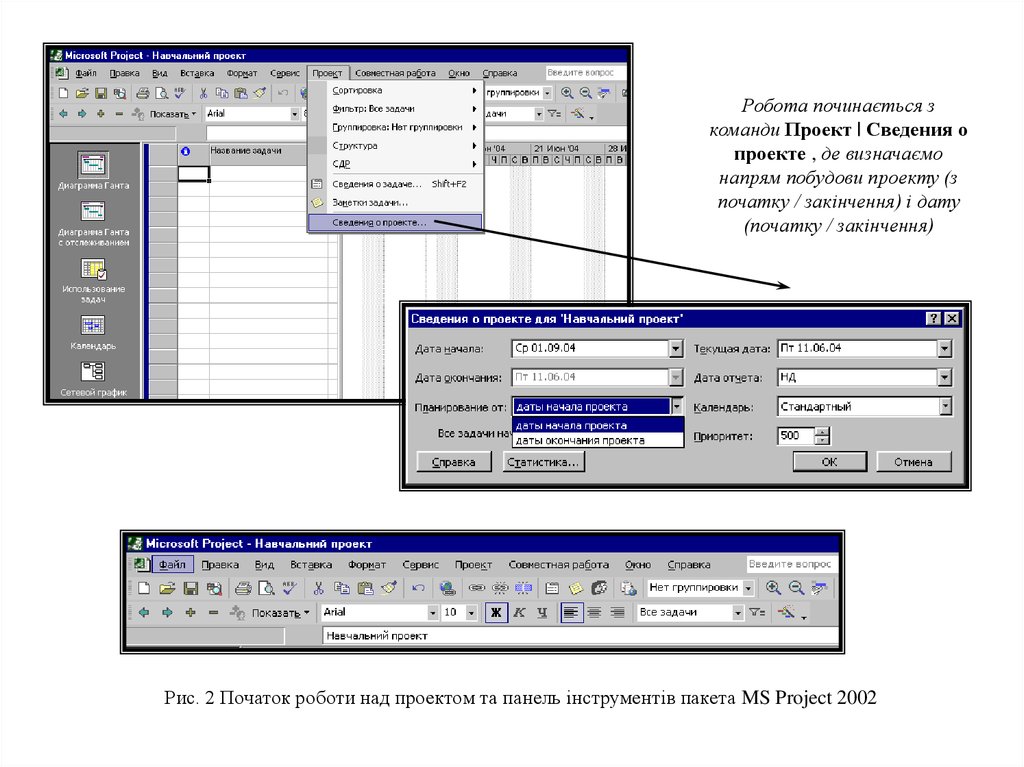 Рис. 2 Початок роботи над проектом та панель інструментів пакета MS Project 2002