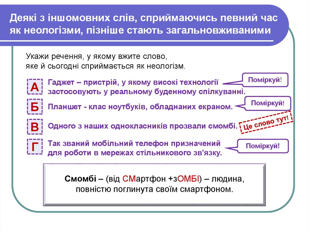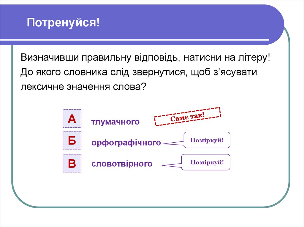 Потренуйся!Визначивши правильну відповідь, натисни на літеру!