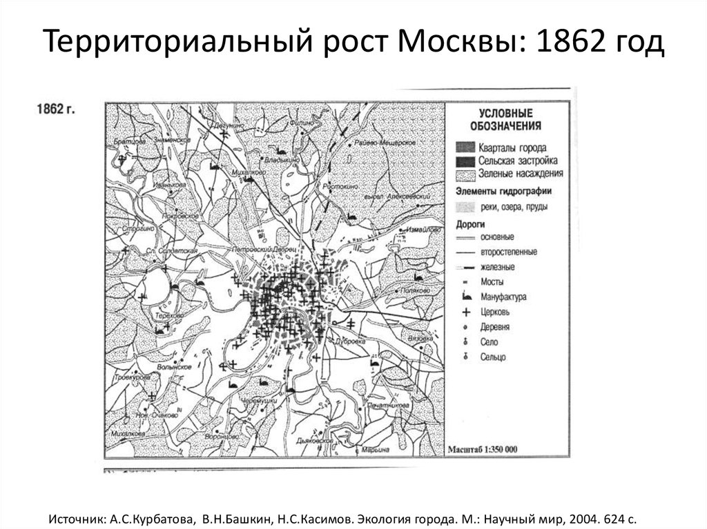 Территориальный рост Москвы: 1862 годИсточник: А.С.Курбатова, В.Н.Башкин, Н.С.Касимов. Экология города. М.: Научный мир, 2004. 624 с.