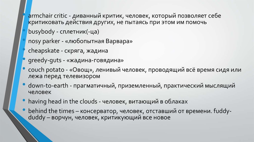 • armchair critic - диванный критик, человек, который позволяет себекритиковать действия других, не пытаясь при этом им помочь