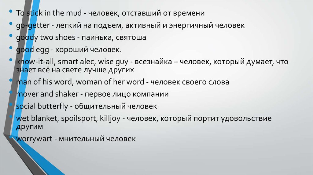• To stick in the mud - человек, отставший от времени• go-getter - легкий на подъем, активный и энергичный человек