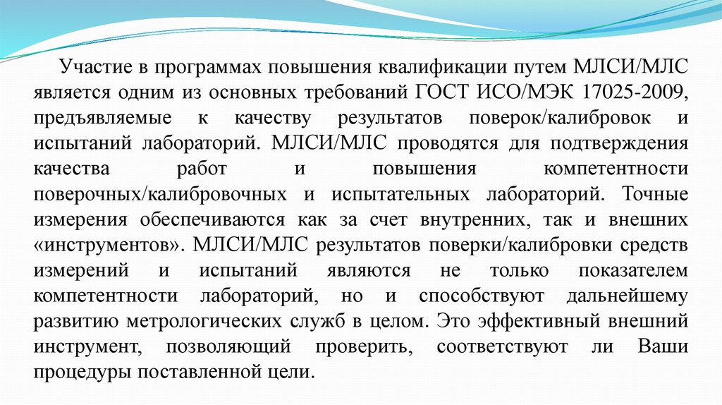 Участие в программах повышения квалификации путем МЛСИ/МЛСявляется одним из основных требований ГОСТ ИСО/МЭК 17025-2009,