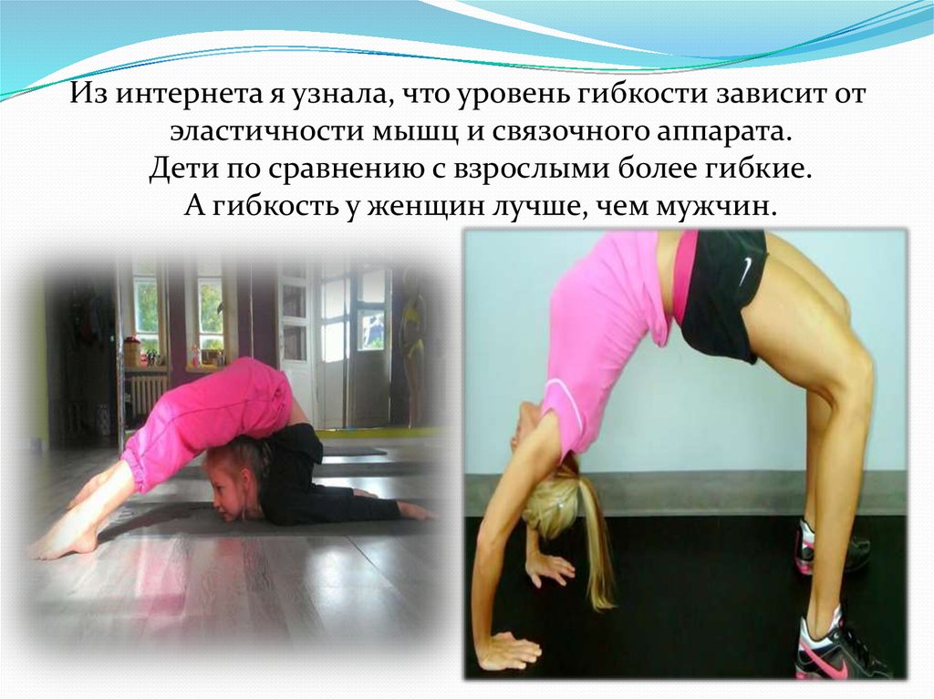 Из интернета я узнала, что уровень гибкости зависит отэластичности мышц и связочного аппарата.