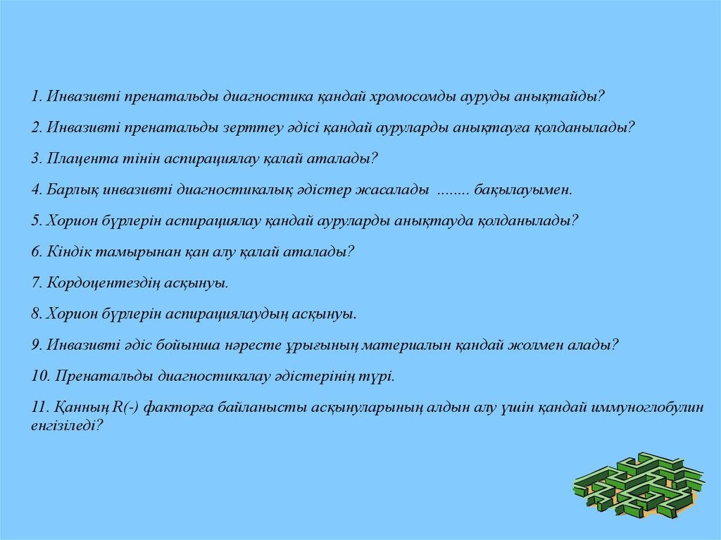 1. Инвазивті пренатальды диагностика қандай хромосомды ауруды анықтайды?2. Инвазивті пренатальды зерттеу әдісі қандай ауруларды анықтауға қолданылады?