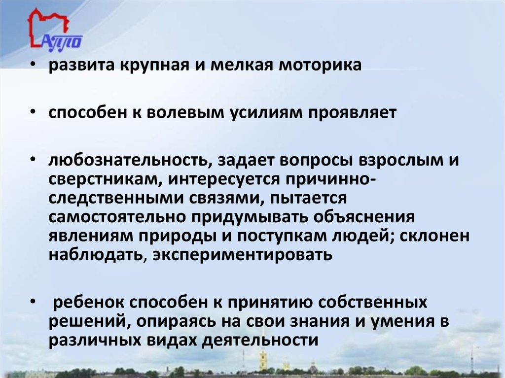 • развита крупная и мелкая моторика• способен к волевым усилиям проявляет