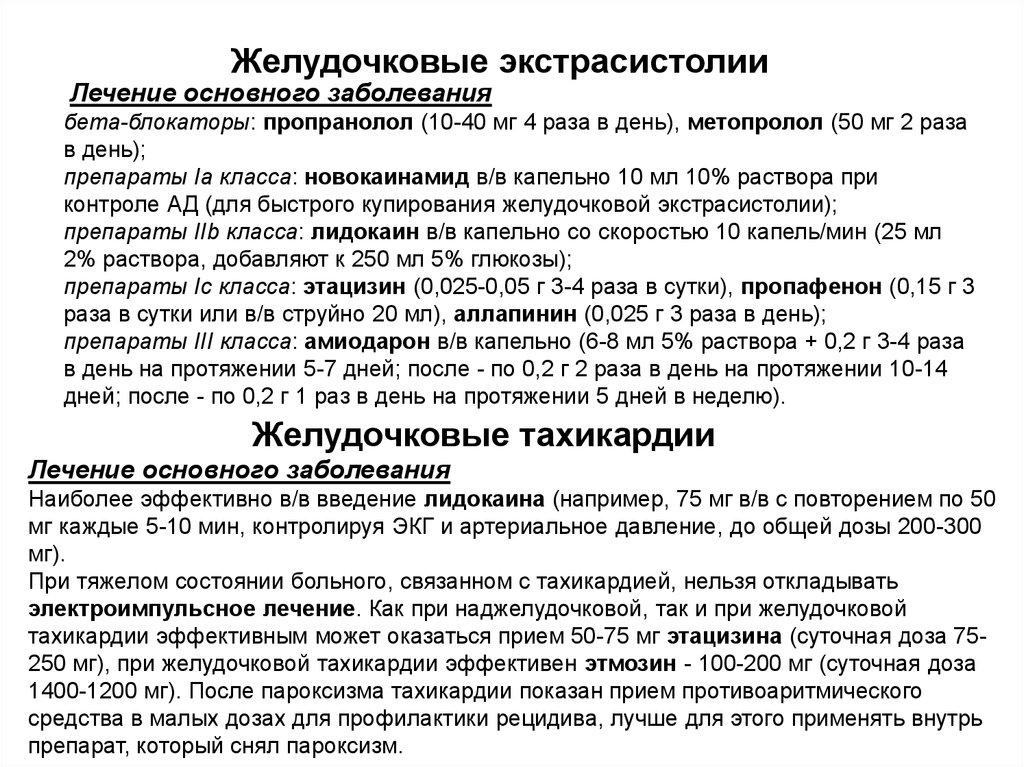 тахикардии эффективным может оказаться прием 50-75 мг этацизина (суточная доза 75250 мг), при желудочковой тахикардии эффективен этмозин - 100-200 мг (суточная доза