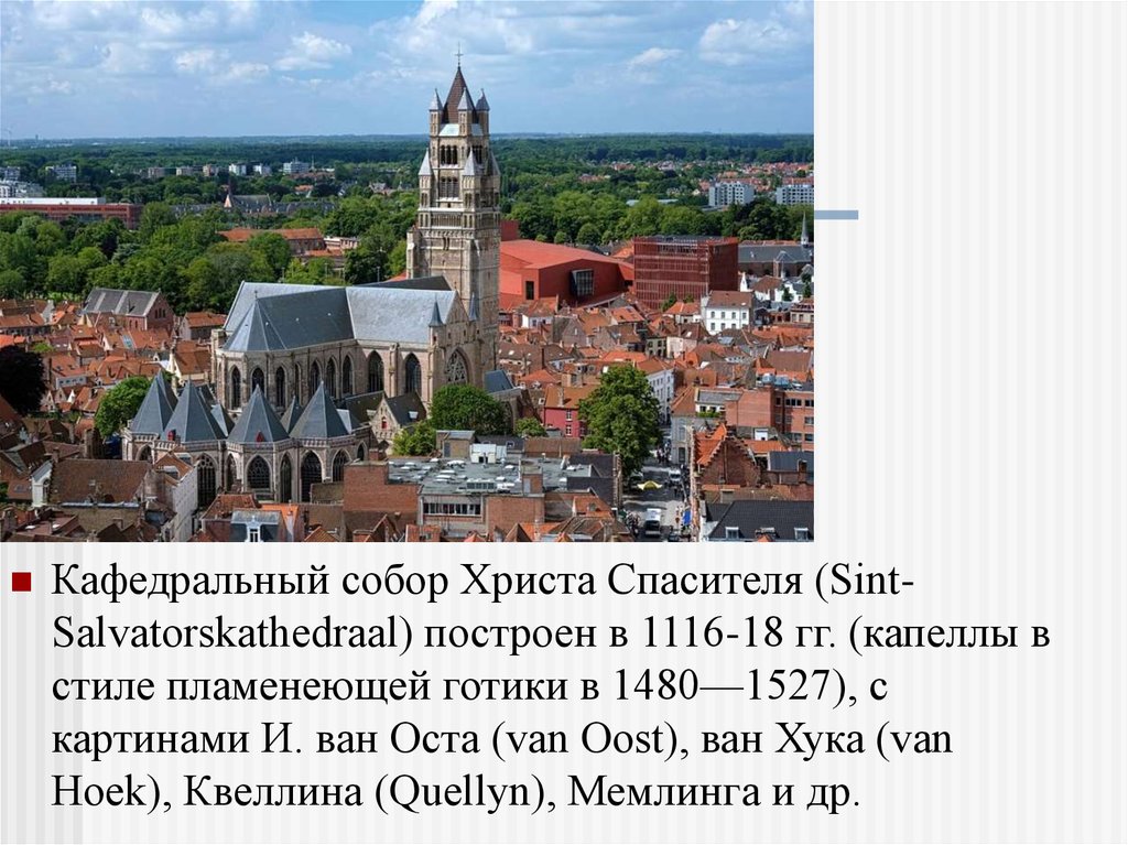 Кафедральный собор Христа Спасителя (SintSalvatorskathedraal) построен в 1116-18 гг. (капеллы встиле пламенеющей готики в 1480—1527), с