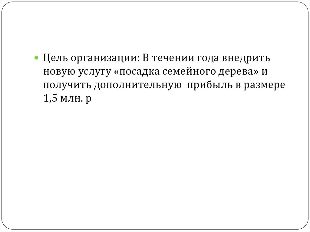 Цель организации: В течении года внедритьновую услугу «посадка семейного дерева» и