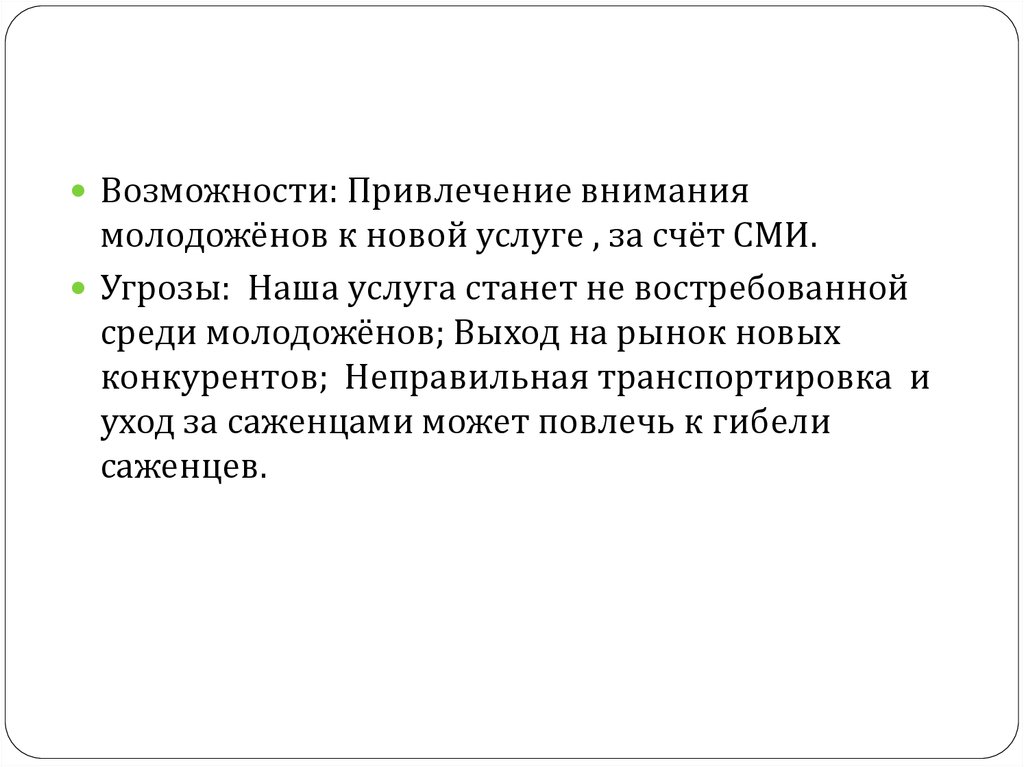 Слабые стороны: Недостаток специалистов по посадкесаженцев; Высокая ценовая политика по сравнению с