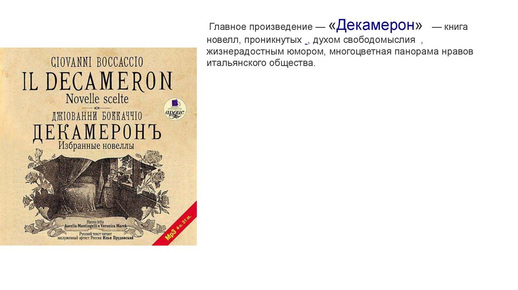 Главное произведение — «Декамерон» — книгановелл, проникнутых , духом свободомыслия ,