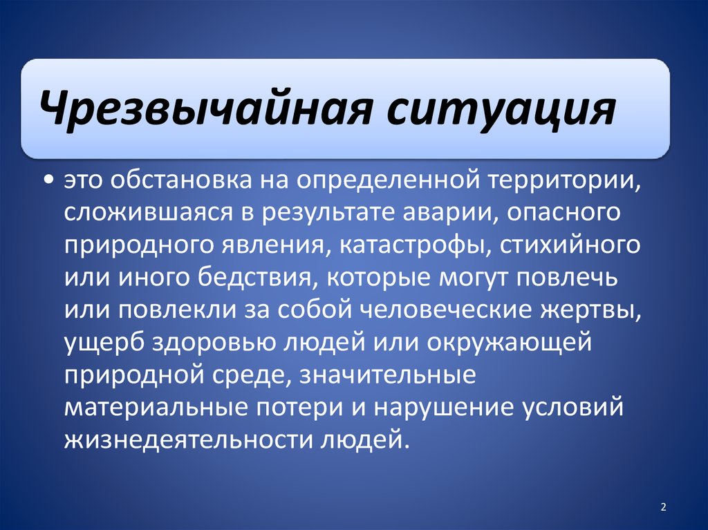 Чрезвычайная ситуация• это обстановка на определенной территории,