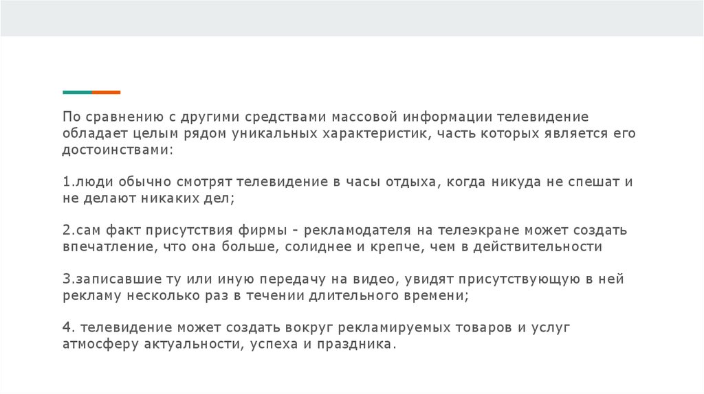 По сравнению с другими средствами массовой информации телевидениеобладает целым рядом уникальных характеристик, часть которых является его