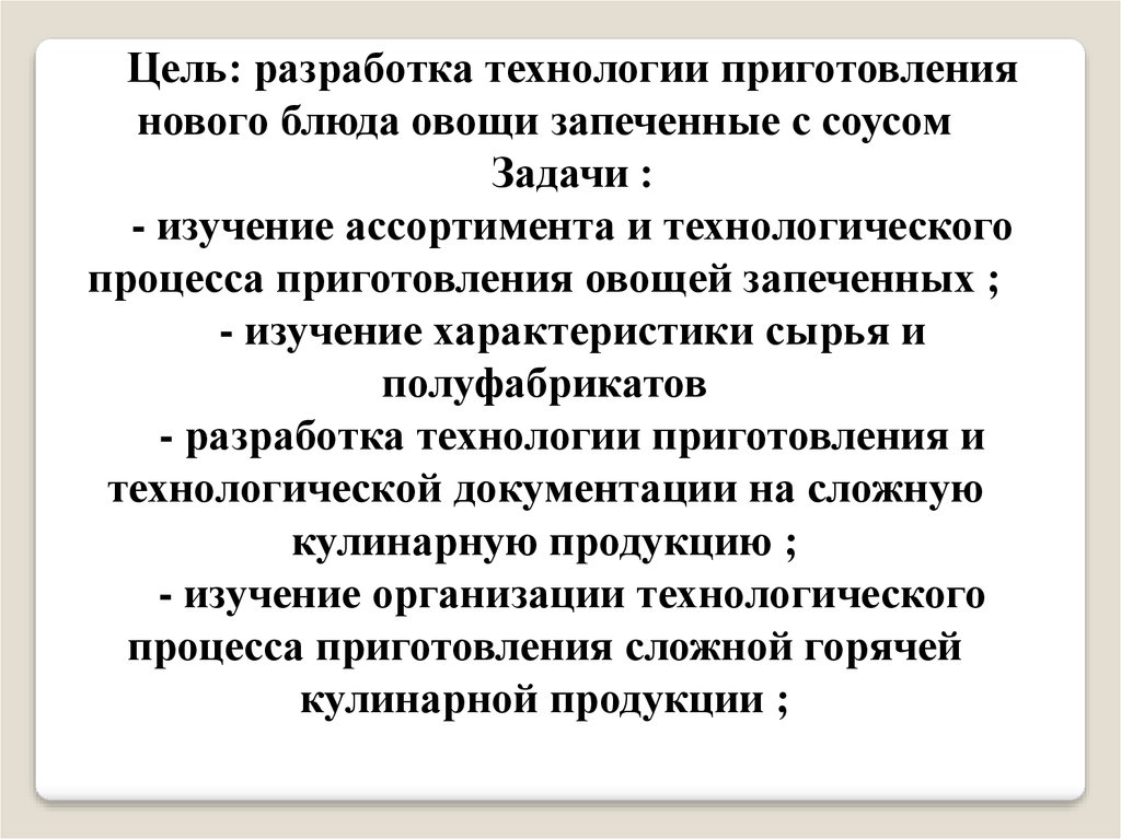 Цель: разработка технологии приготовлениянового блюда овощи запеченные с соусом