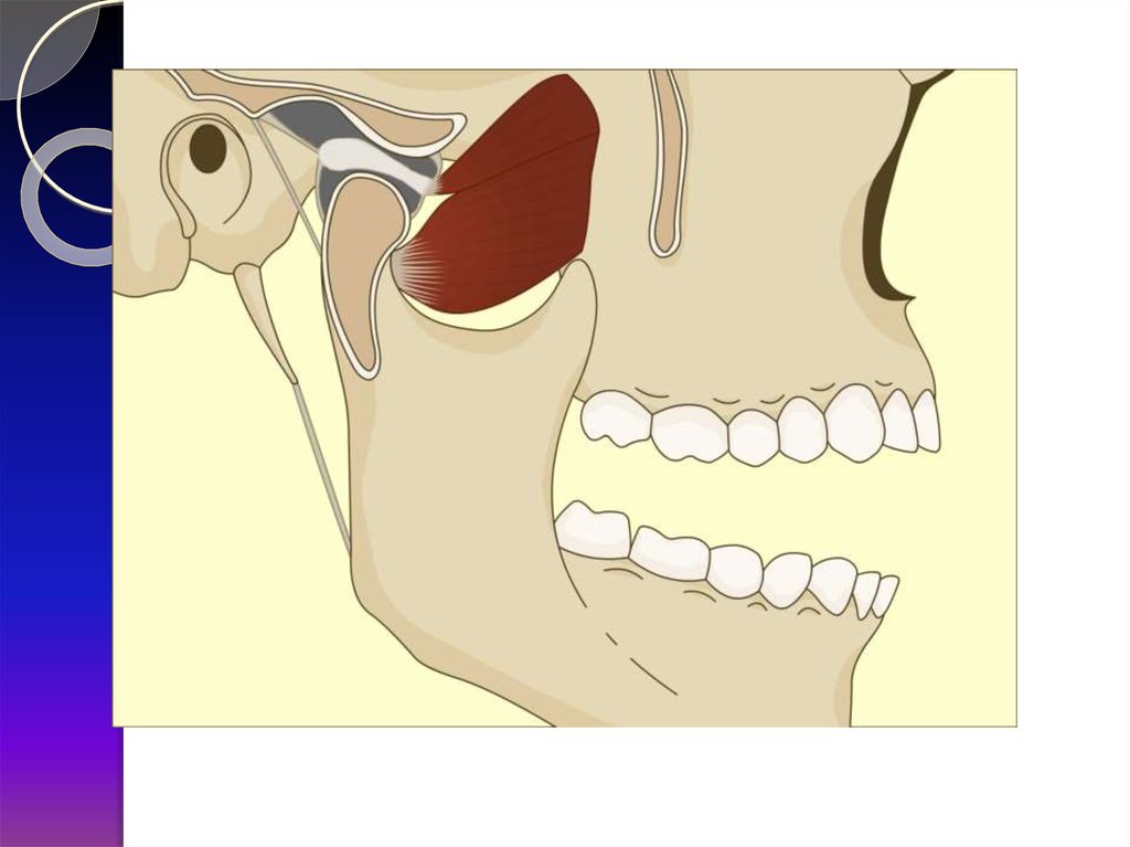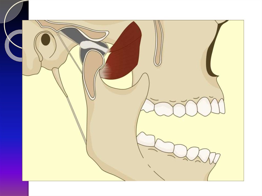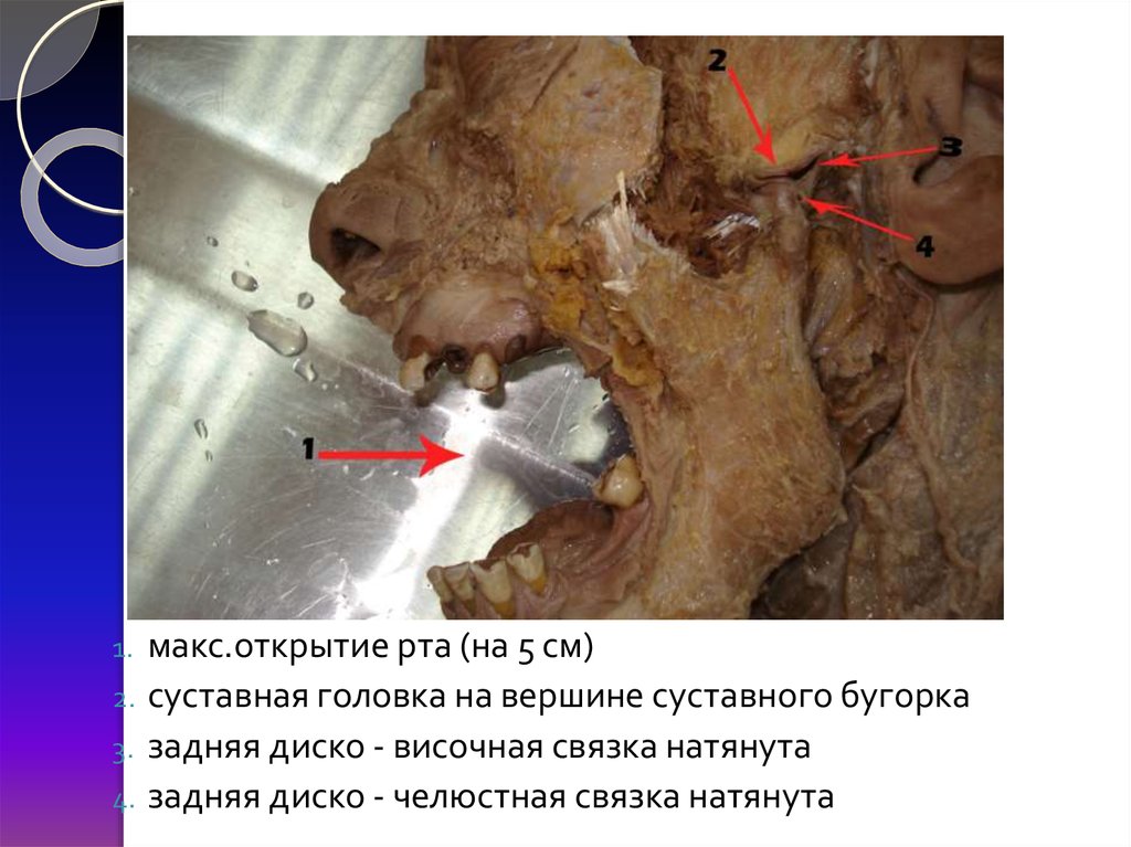 макс.открытие рта (на 5 см)2. суставная головка на вершине суставного бугорка