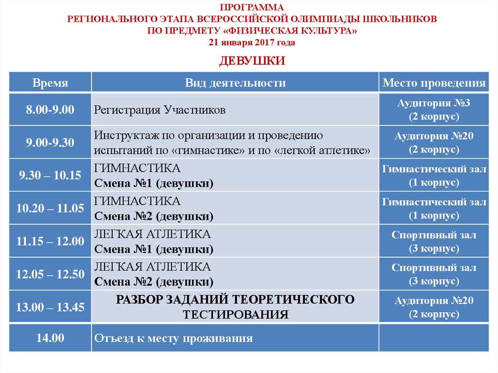 Программа регионального этапа всероссийской олимпиады школьников по предмету физическая культура. Списки участников