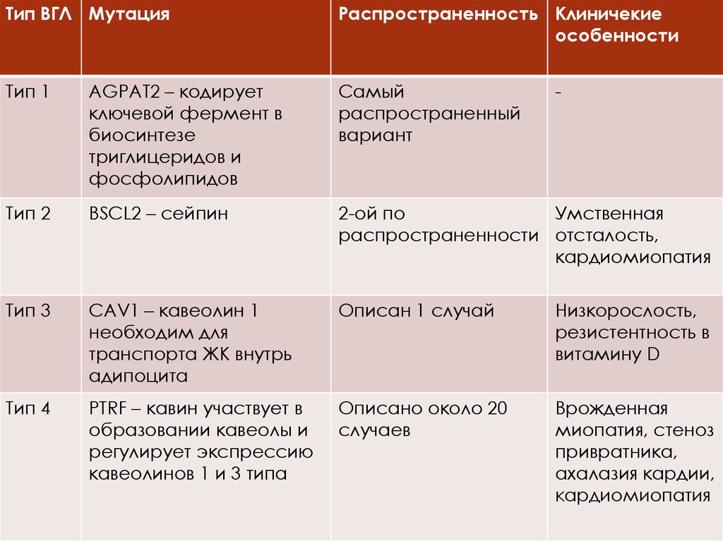 Тип ВГЛ МутацияРаспространенность Клиничекие