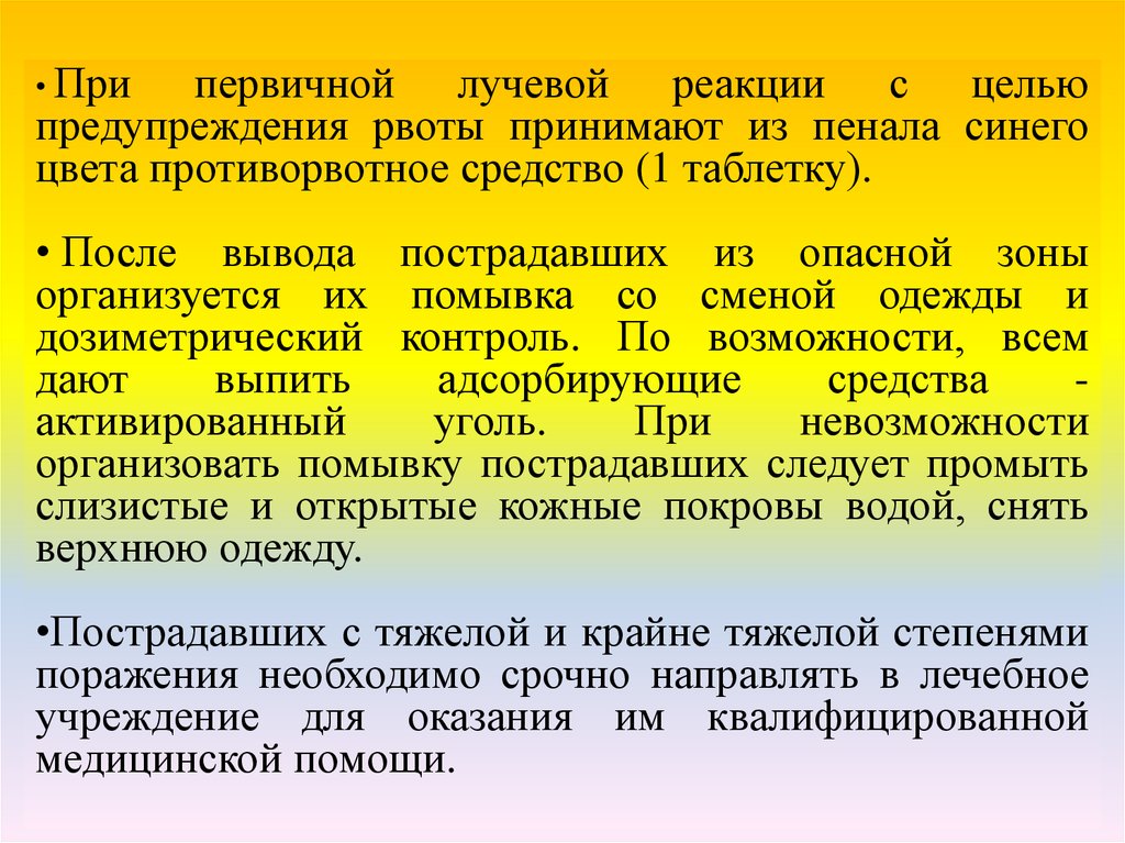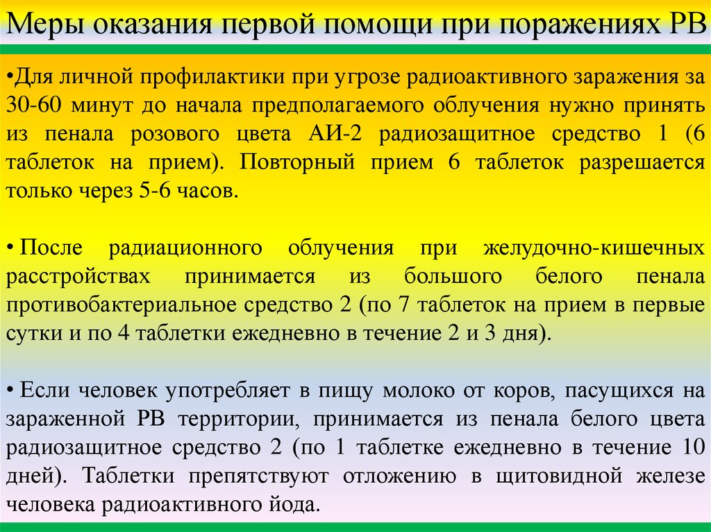 Меры оказания первой помощи при поражениях РВ•Для личной профилактики при угрозе радиоактивного заражения за