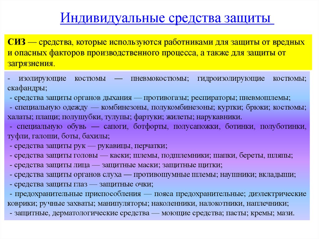 Индивидуальные средства защитыСИЗ — средства, которые используются работниками для защиты от вредных