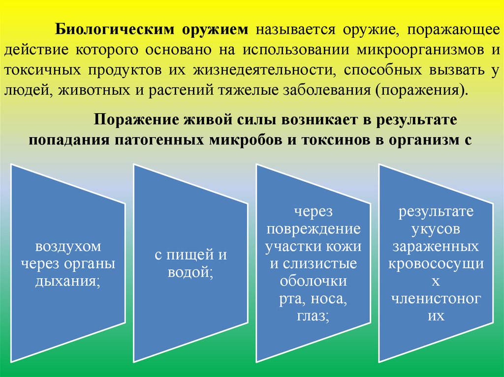 Биологическим оружием называется оружие, поражающеедействие которого основано на использовании микроорганизмов и