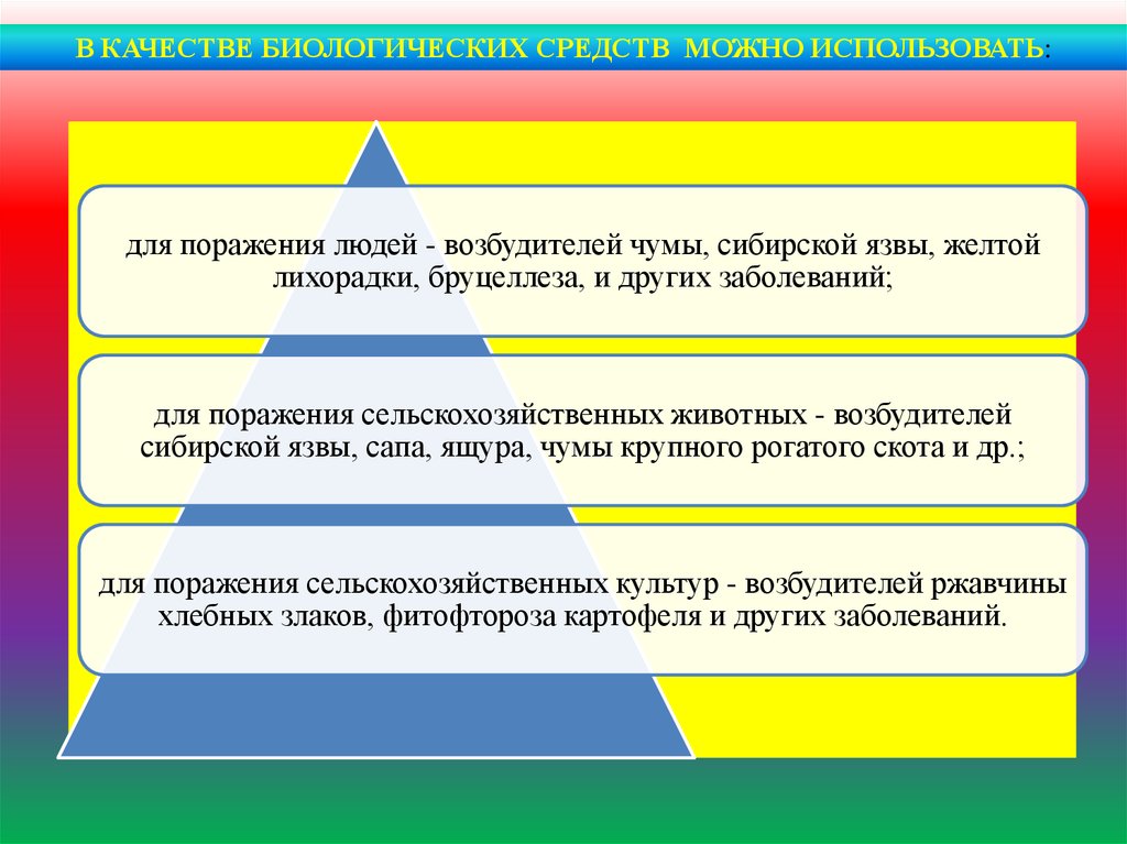 В КАЧЕСТВЕ БИОЛОГИЧЕСКИХ СРЕДСТВ МОЖНО ИСПОЛЬЗОВАТЬ:для поражения людей - возбудителей чумы, сибирской язвы, желтой