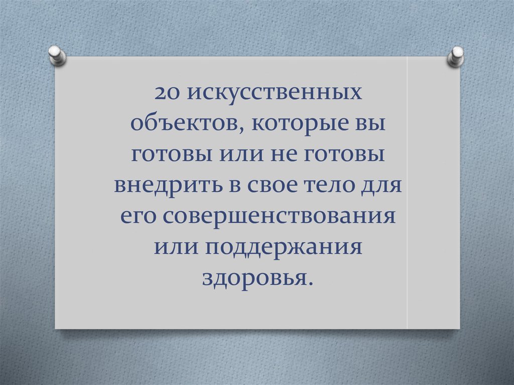 1. 20 искусственных объектов, которые вы готовы или не готовы внедрить в свое тело для его совершенствования или поддержания
