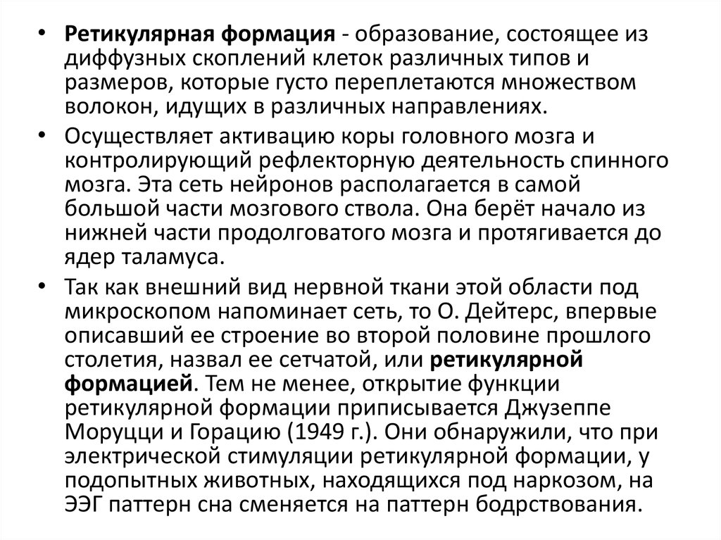 • Ретикулярная формация - образование, состоящее издиффузных скоплений клеток различных типов и
