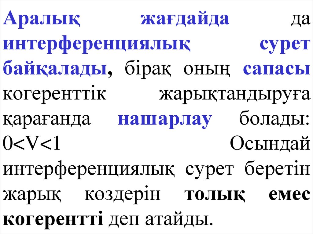 12. Аралық жағдайда да интерференциялық сурет байқалады, бірақ оның сапасы когеренттік жарықтандыруға қарағанда нашарлау болады:
